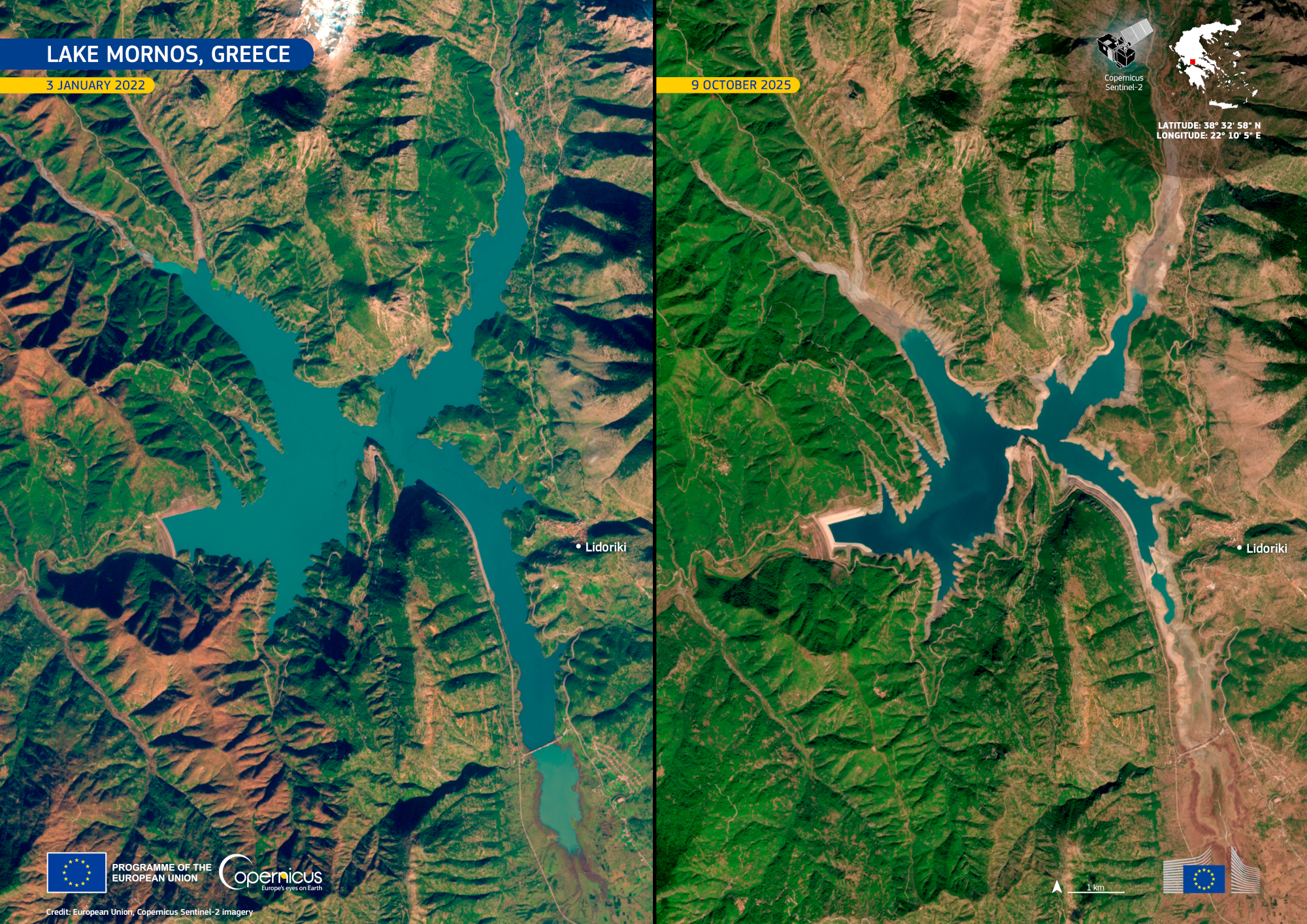These Copernicus Sentinel-2 satellite images, acquired on 3 January 2022 and 9 October 2025, show the decrease in water volume in Lake Mornos over this period. The lake has visibly receded, revealing stretches of shoreline and lakebed.